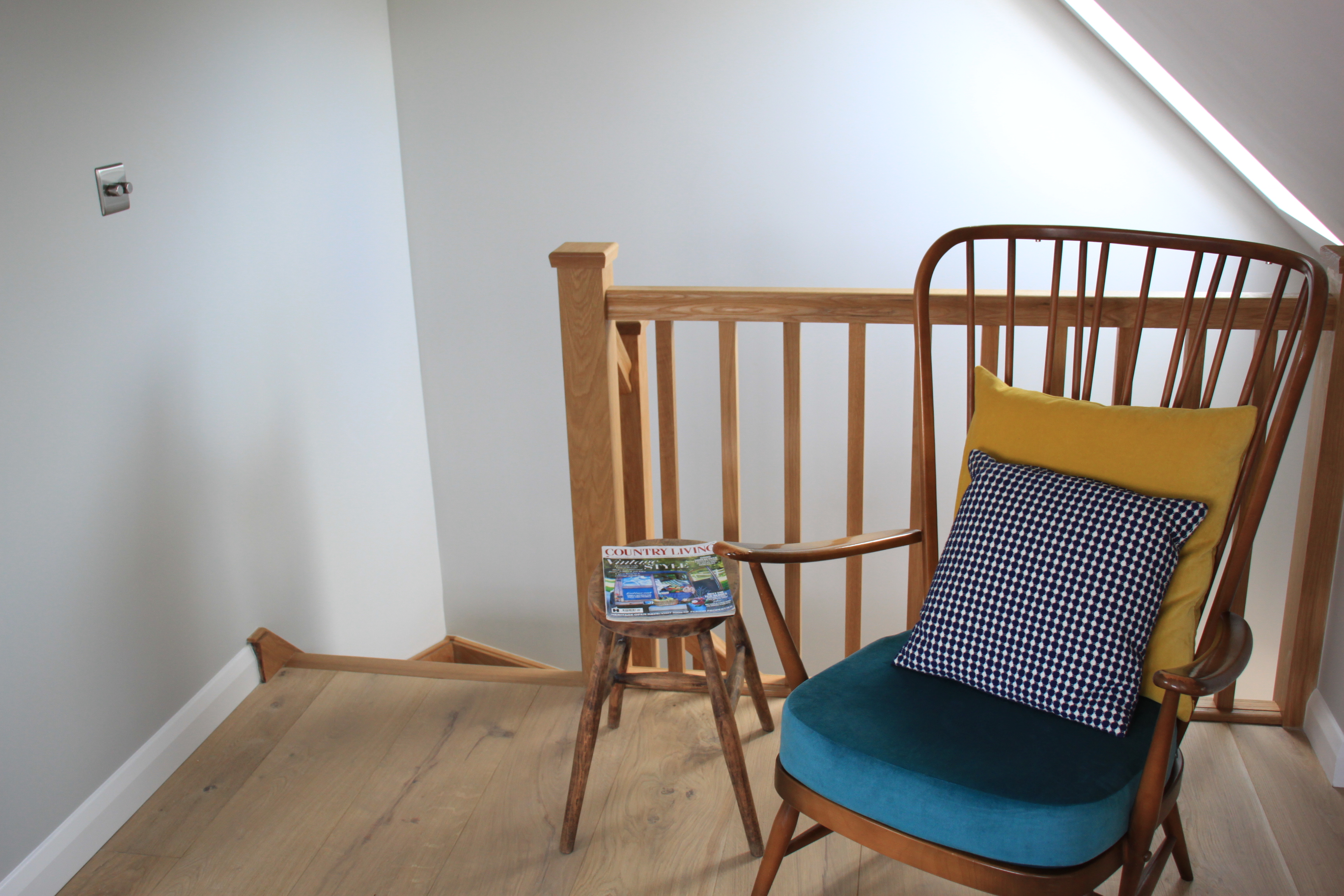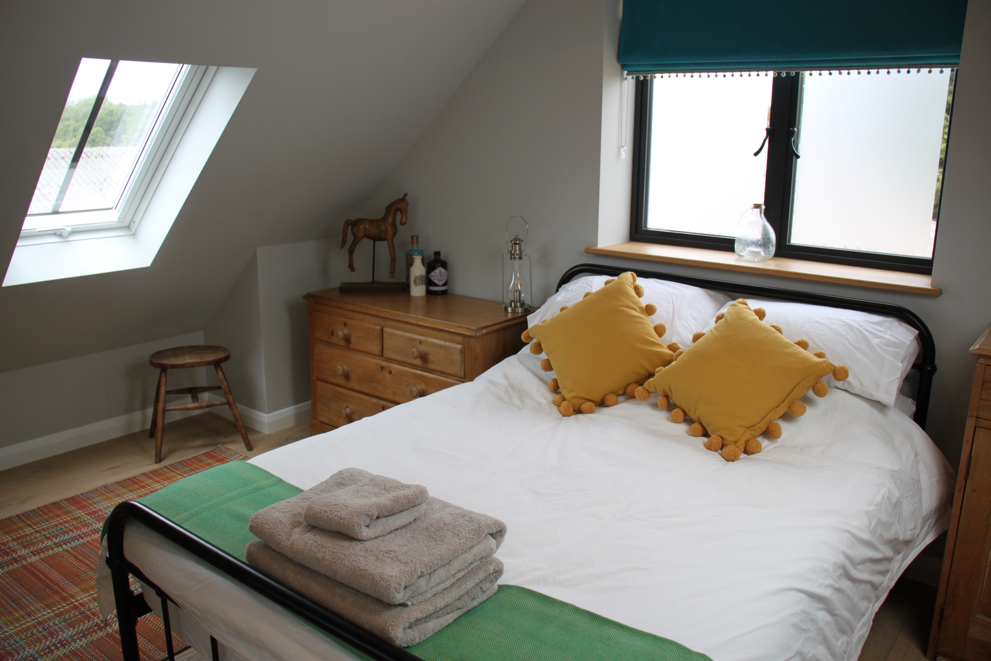 Heading up the oak staircase you come upon the beautifully vaulted ceiling under which sits the bedroom with its eclectic mix of old and new. From stripped back oak floorboards with divine underfloor heating to a 50-year-old Ercol armchair donned in vibrant teal velvet to antique pine cupboards to a contemporary luxurious double bed, this is the perfect place to recuperate after a day in the great outdoors.