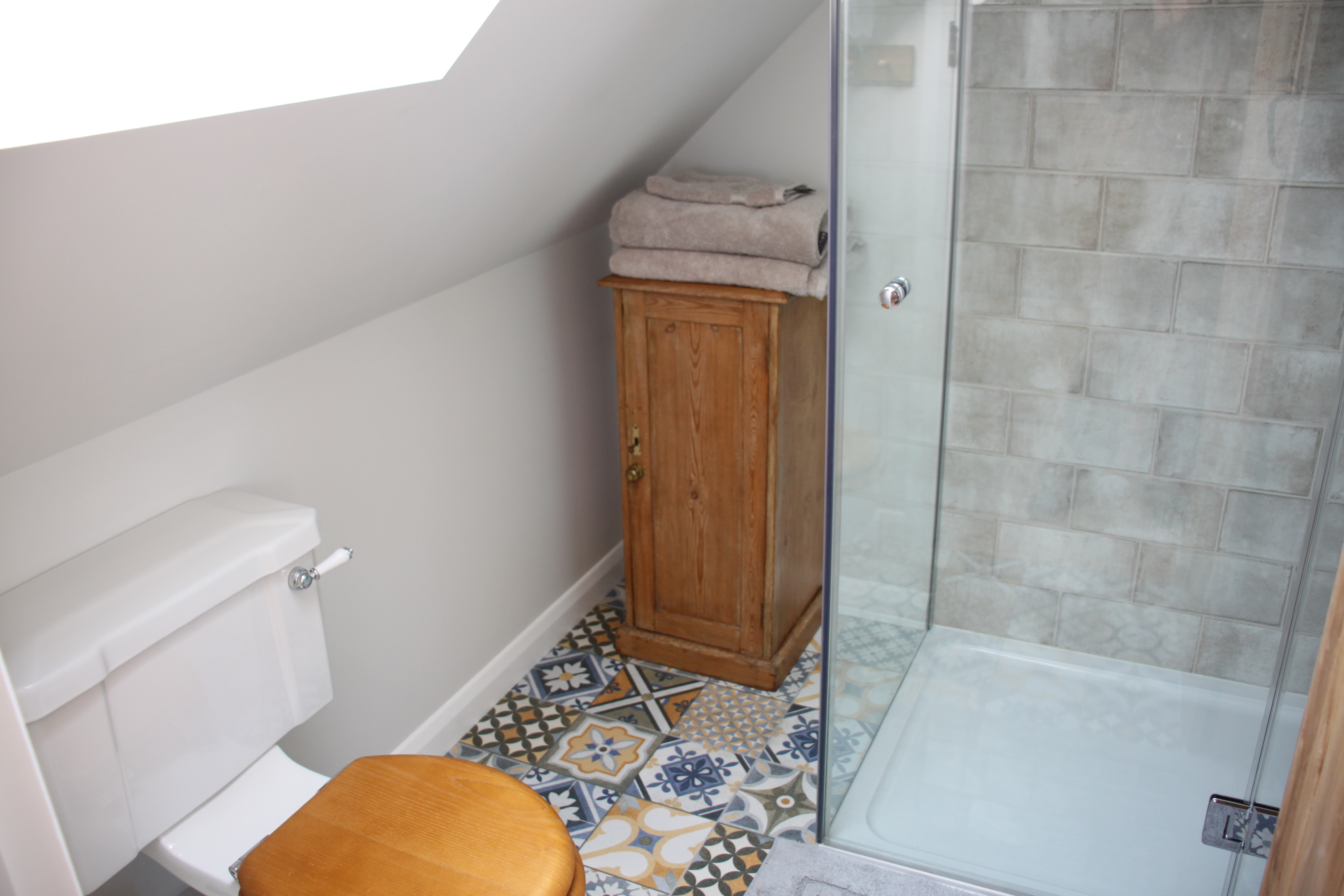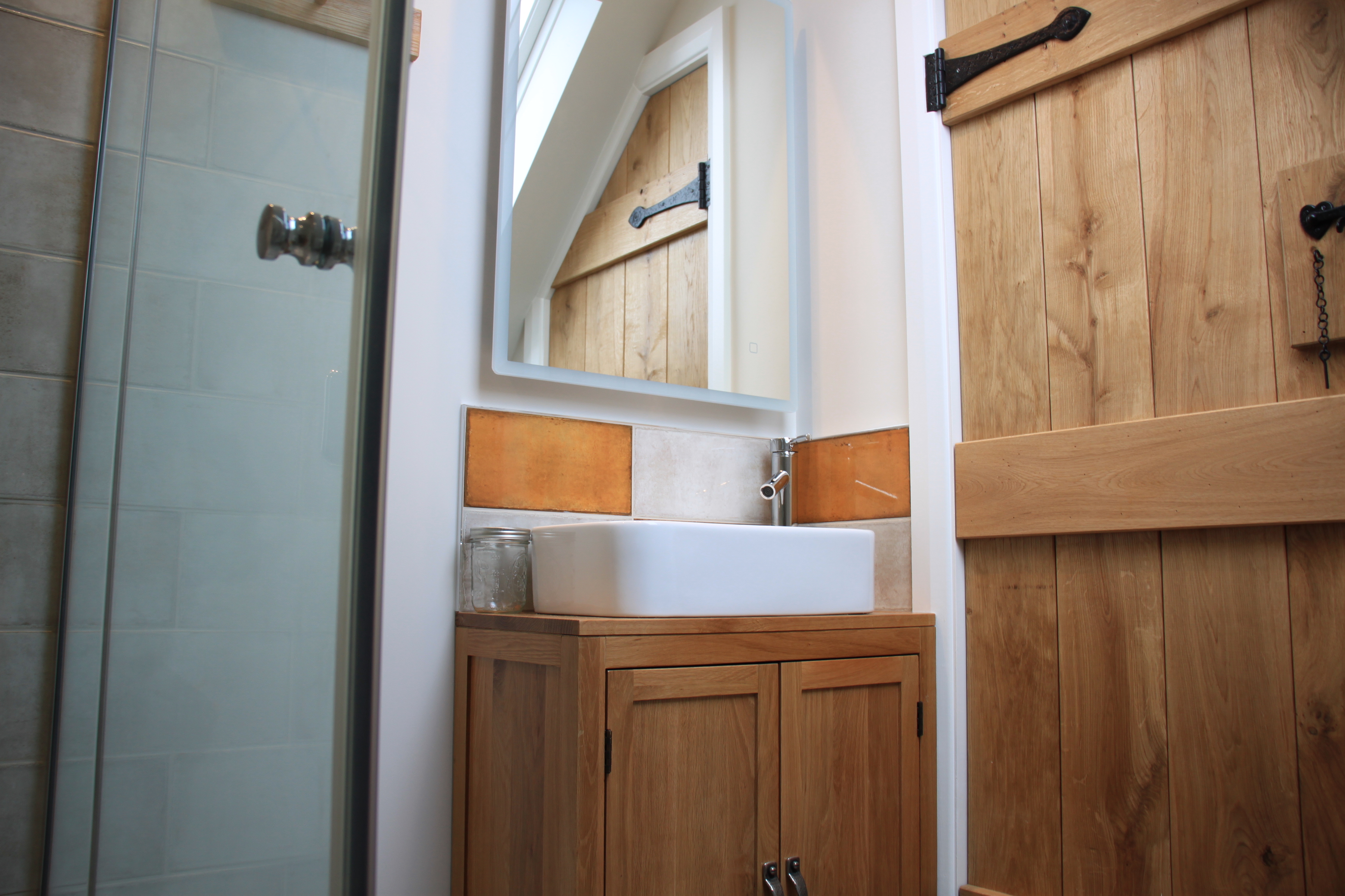 A quirky oak door leads to the enticing shower to invigorate yourself. Oak and pine cupboards give you all the space you need to store all your bathing and beautifying bits and bobs.