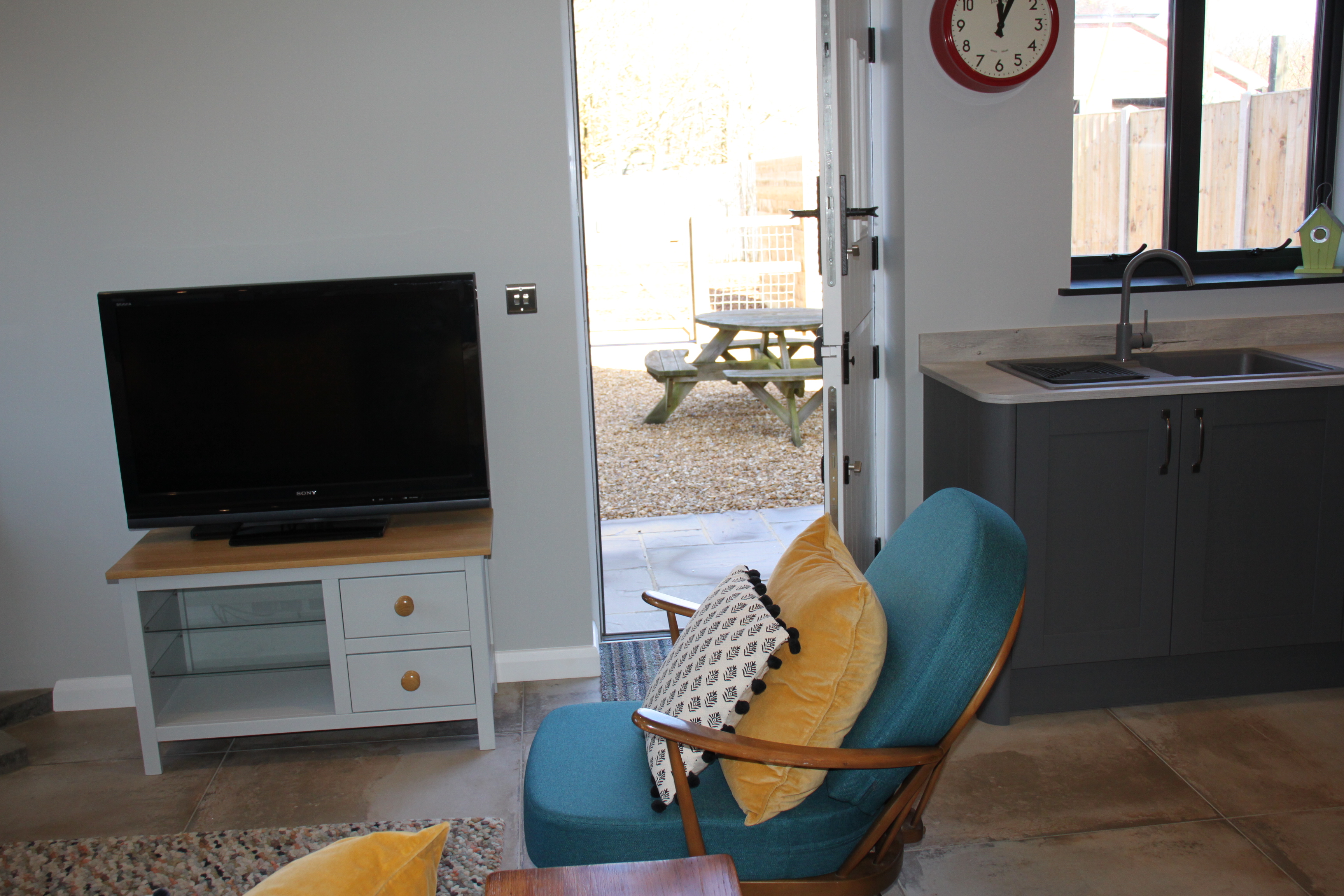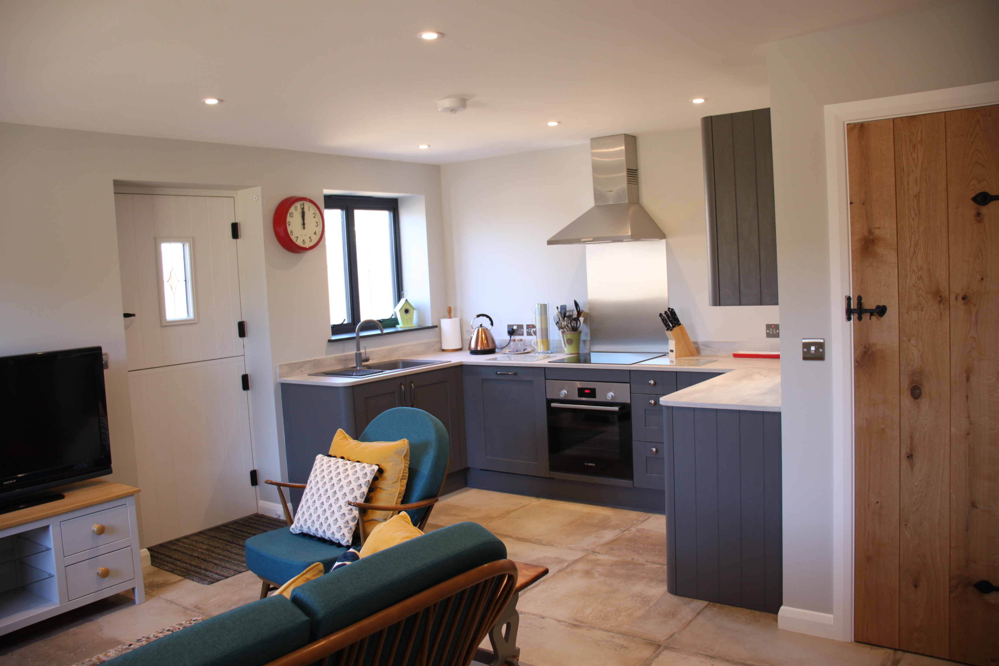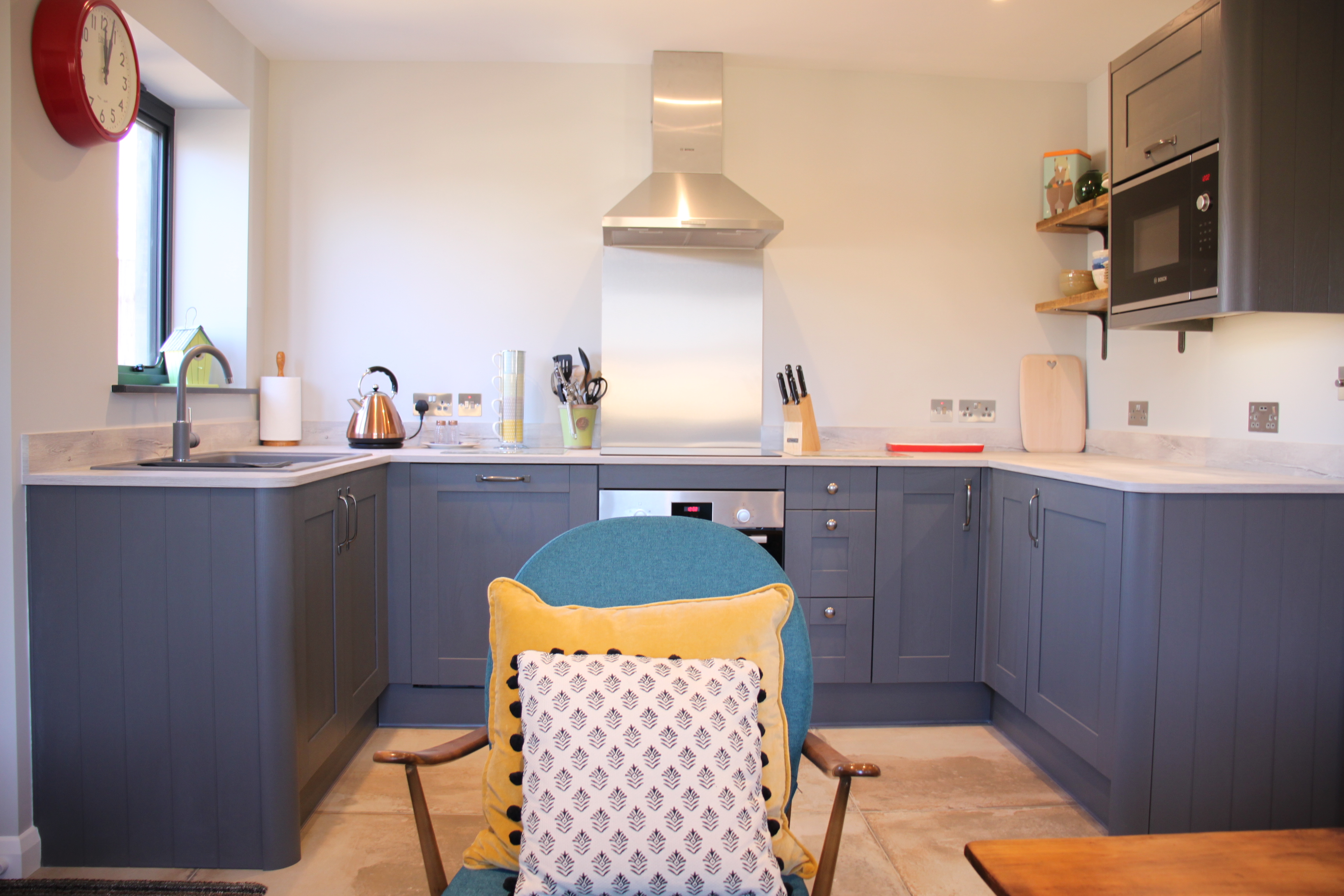 The Byre is a gloriously colourful and bright 1 bedroom retreat on our farm. Downstairs you have an open plan living room with a modern, extremely well equipped kitchen.