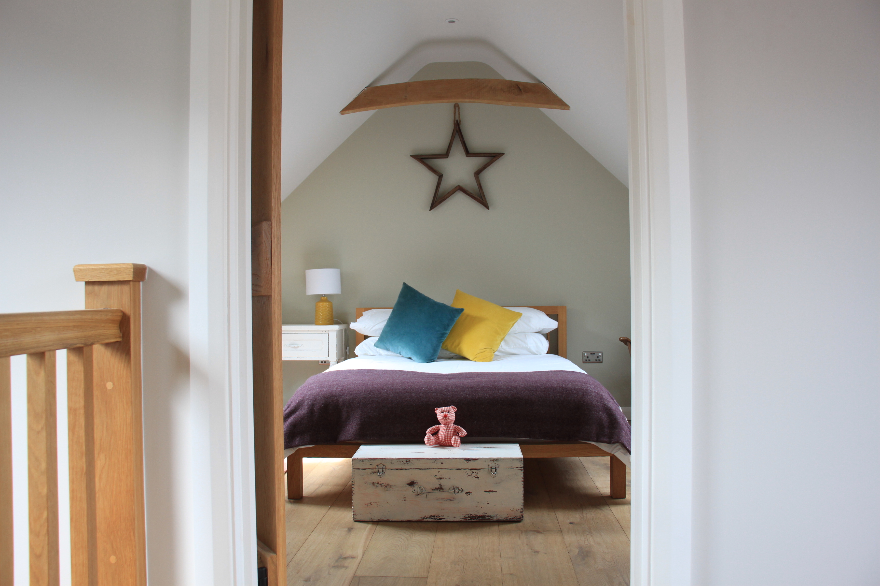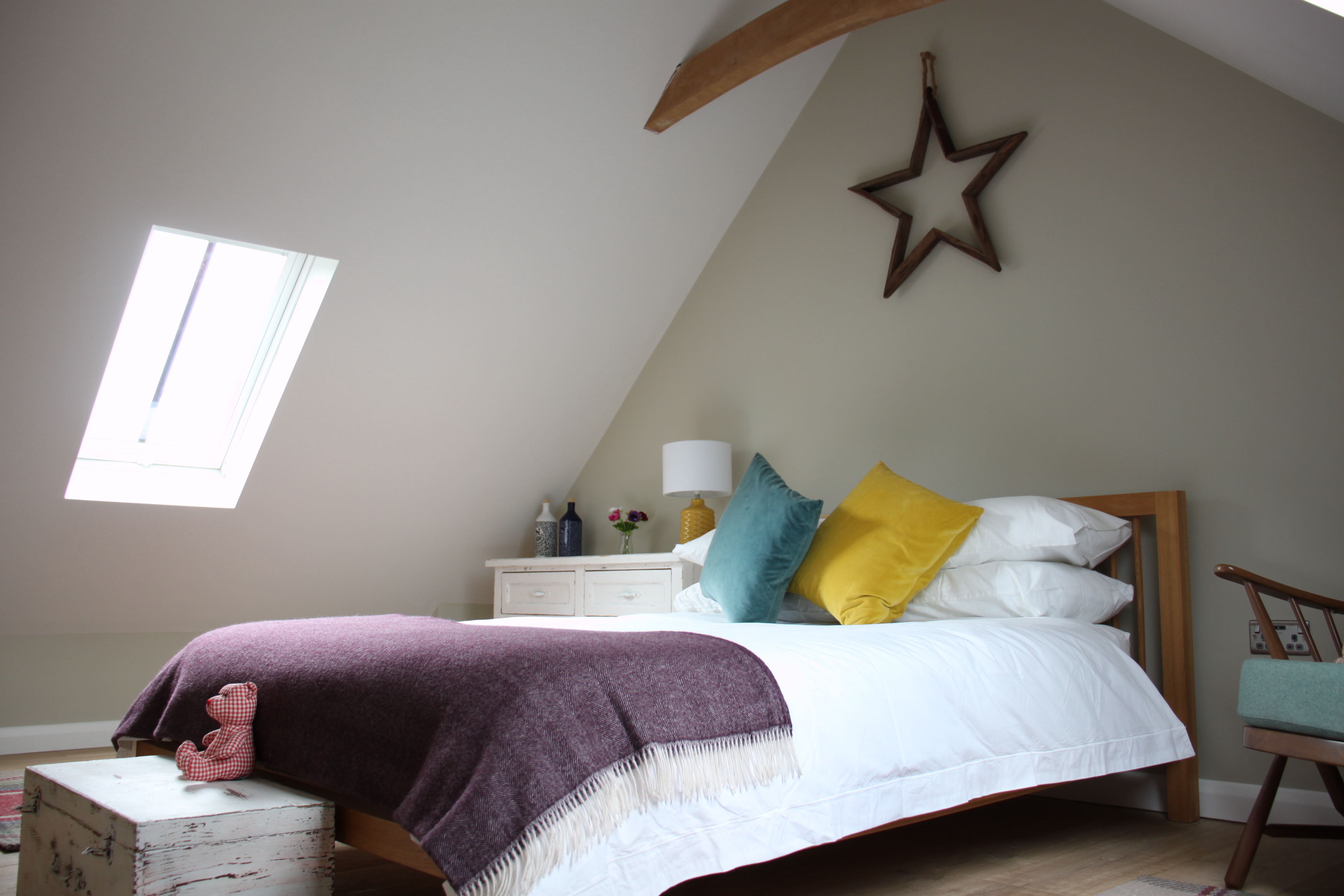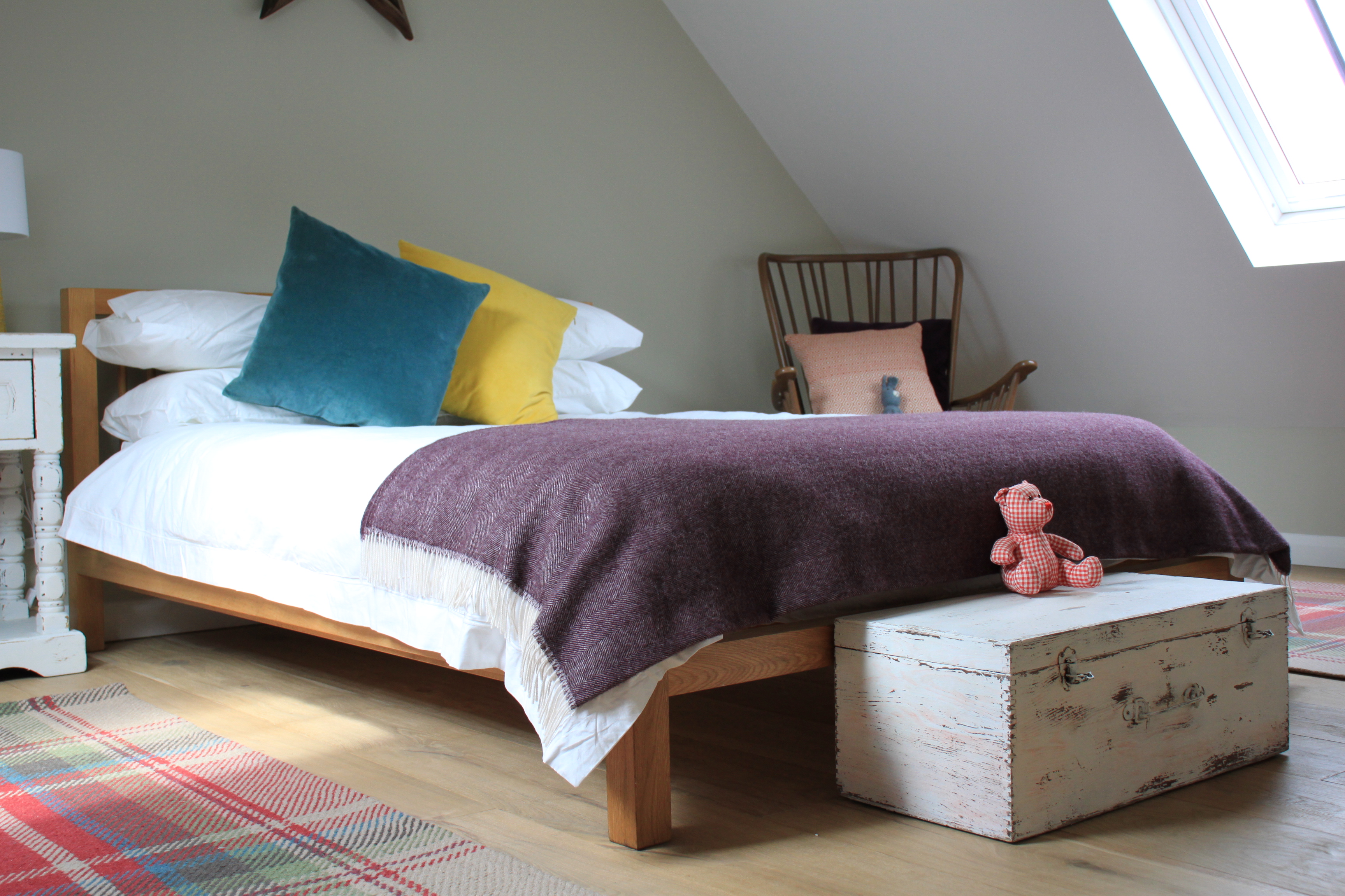 The first bedroom with its eclectic mix of old and new. From stripped back oak floorboards with divine underfloor heating to a 50-year-old Ercol armchair clad delightfully colourful cushion to the centre piece oak double bed with lovely old cupboard either side upon which sit colourfut blue lamps - the perfect place to recuperate after a day in the great outdoors.