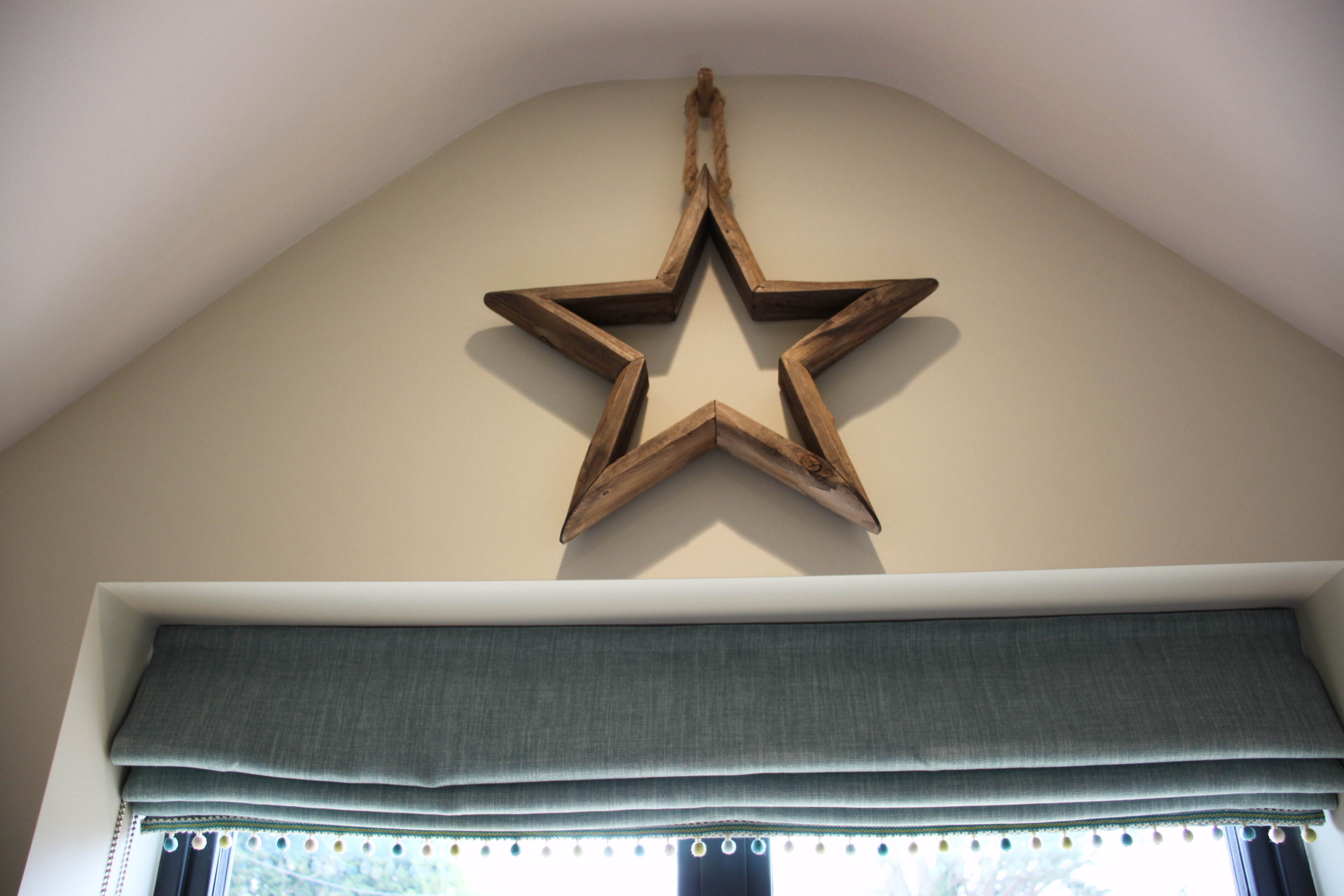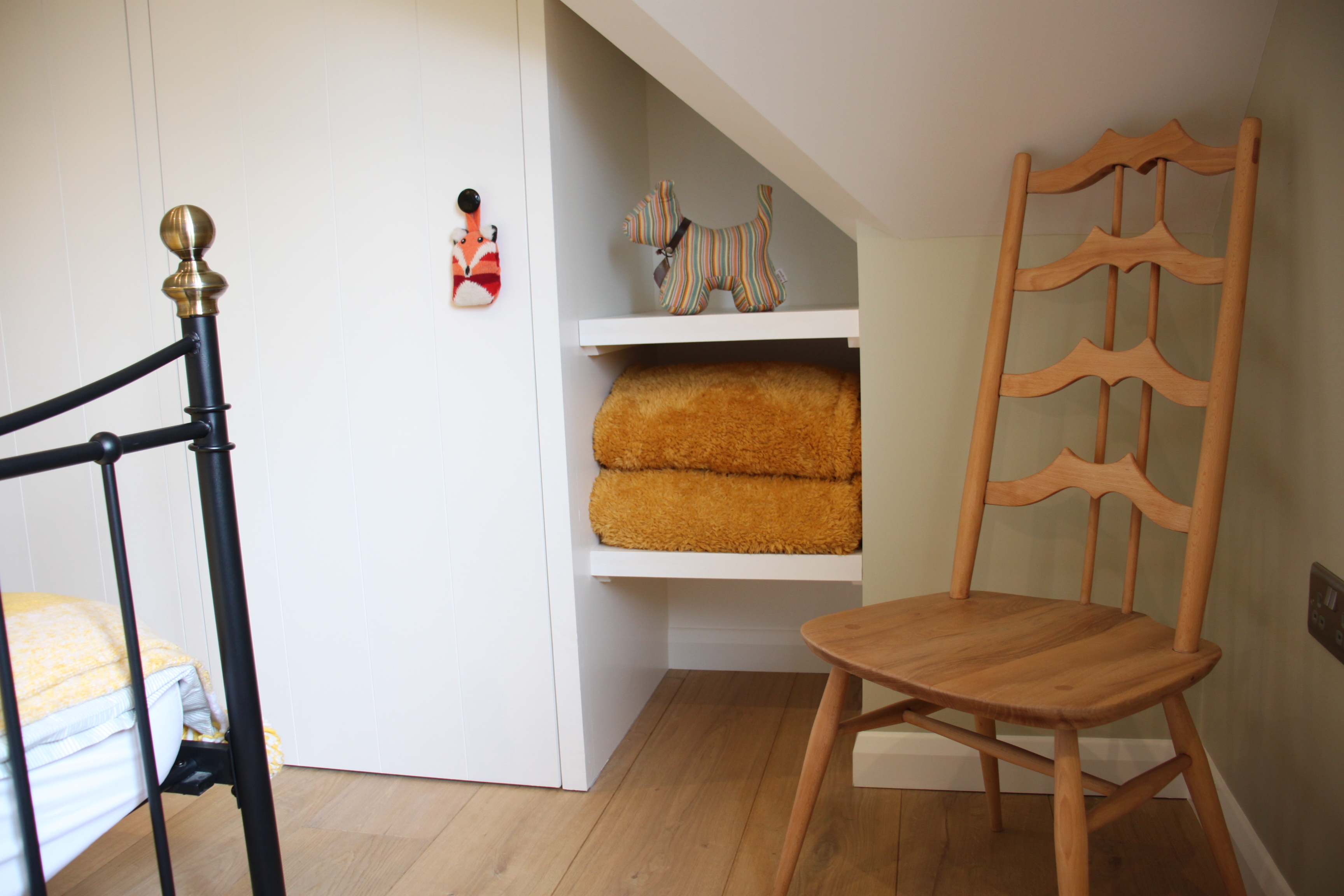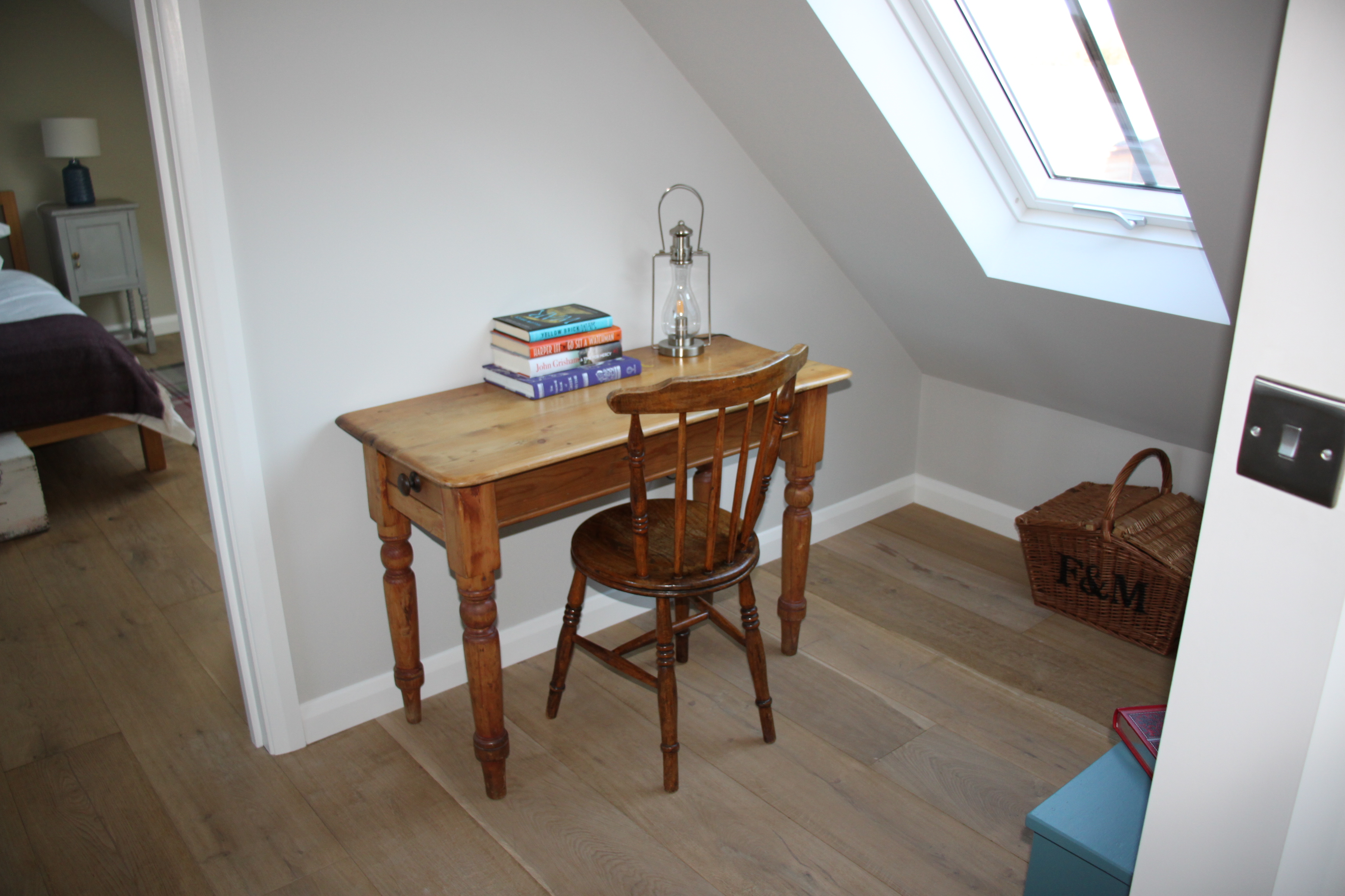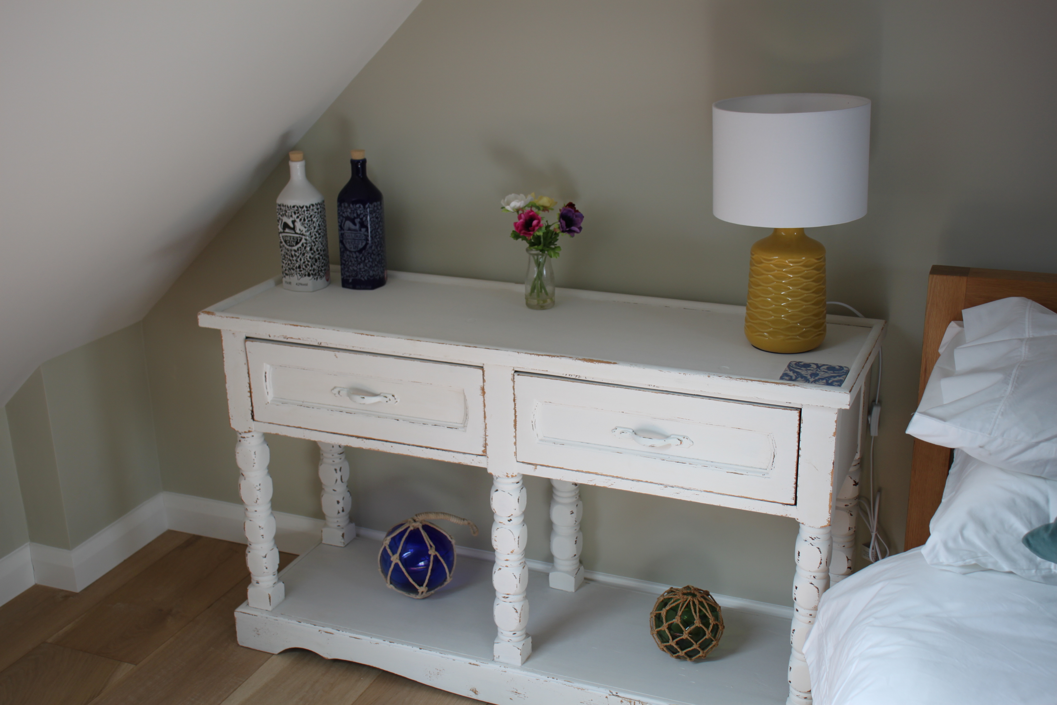 The first bedroom with its eclectic mix of old and new. From stripped back oak floorboards with divine underfloor heating to a 50-year-old Ercol armchair clad delightfully colourful cushion to the centre piece oak double bed with lovely old cupboard either side upon which sit colourfut blue lamps - the perfect place to recuperate after a day in the great outdoors.