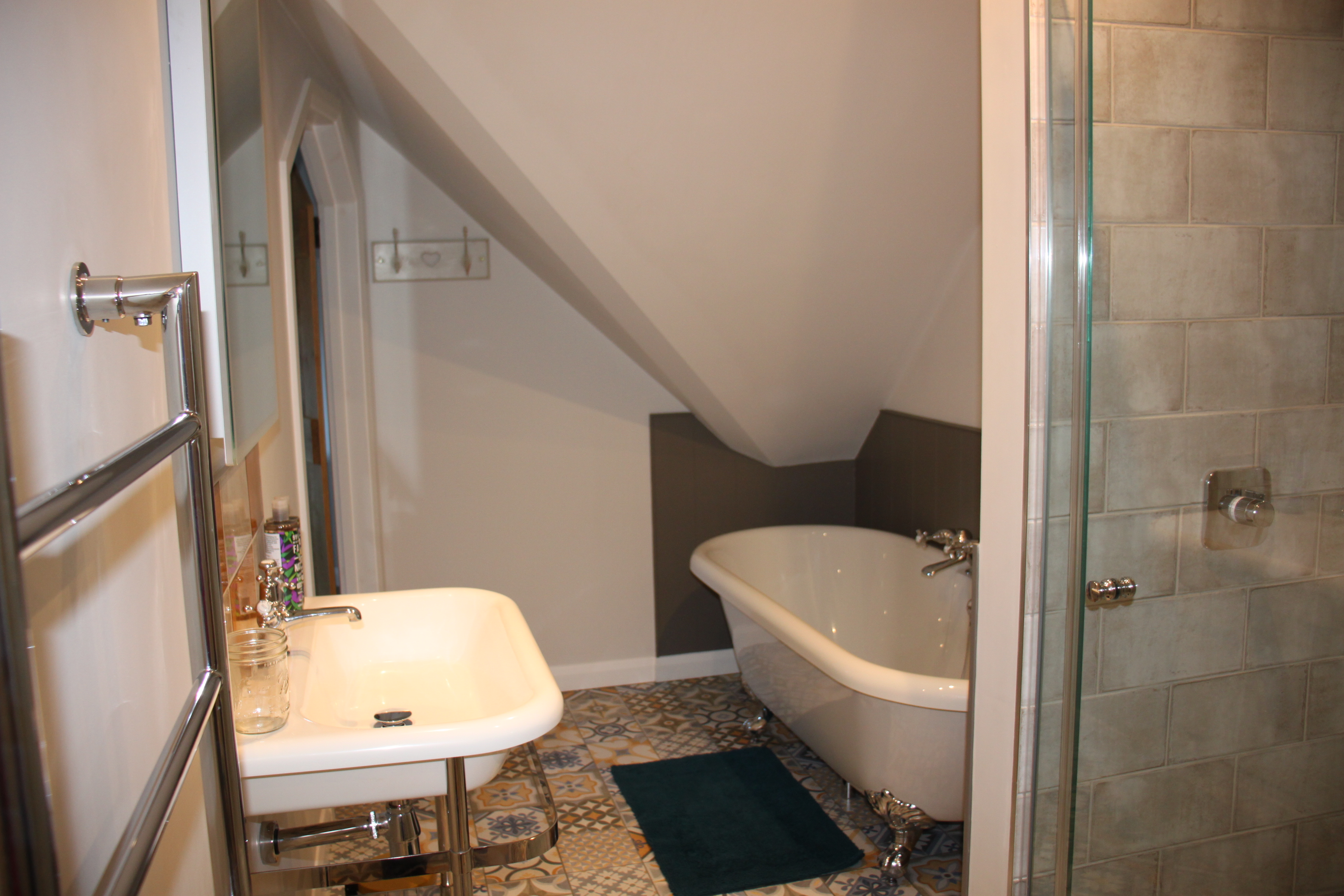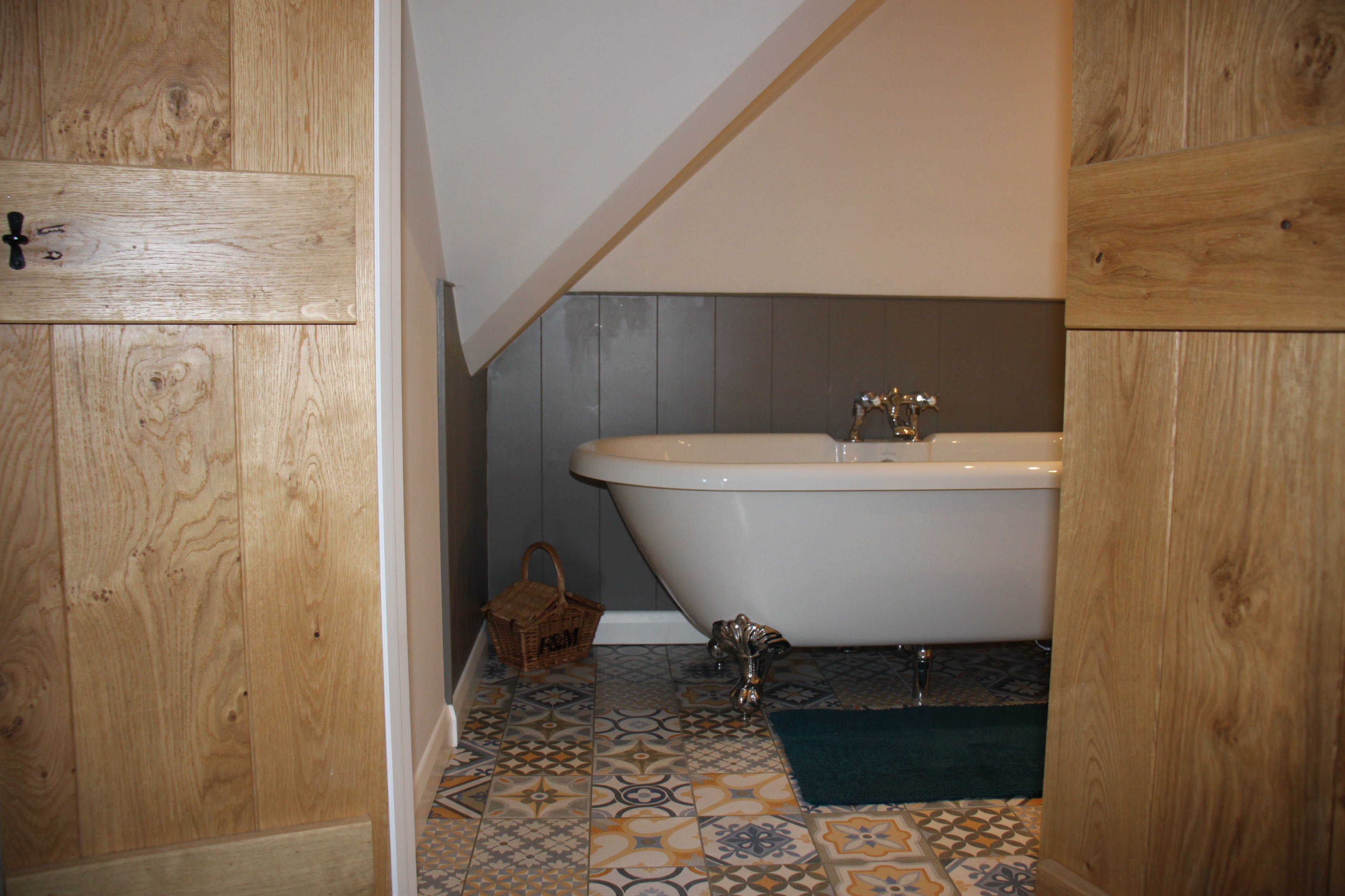A pair of quirky oak doors lead to the bathroom with is rolltop bath and separate enticing shower to invigorate yourself. There are lots of nooks are cranny in this bathroom with their own little surprises.